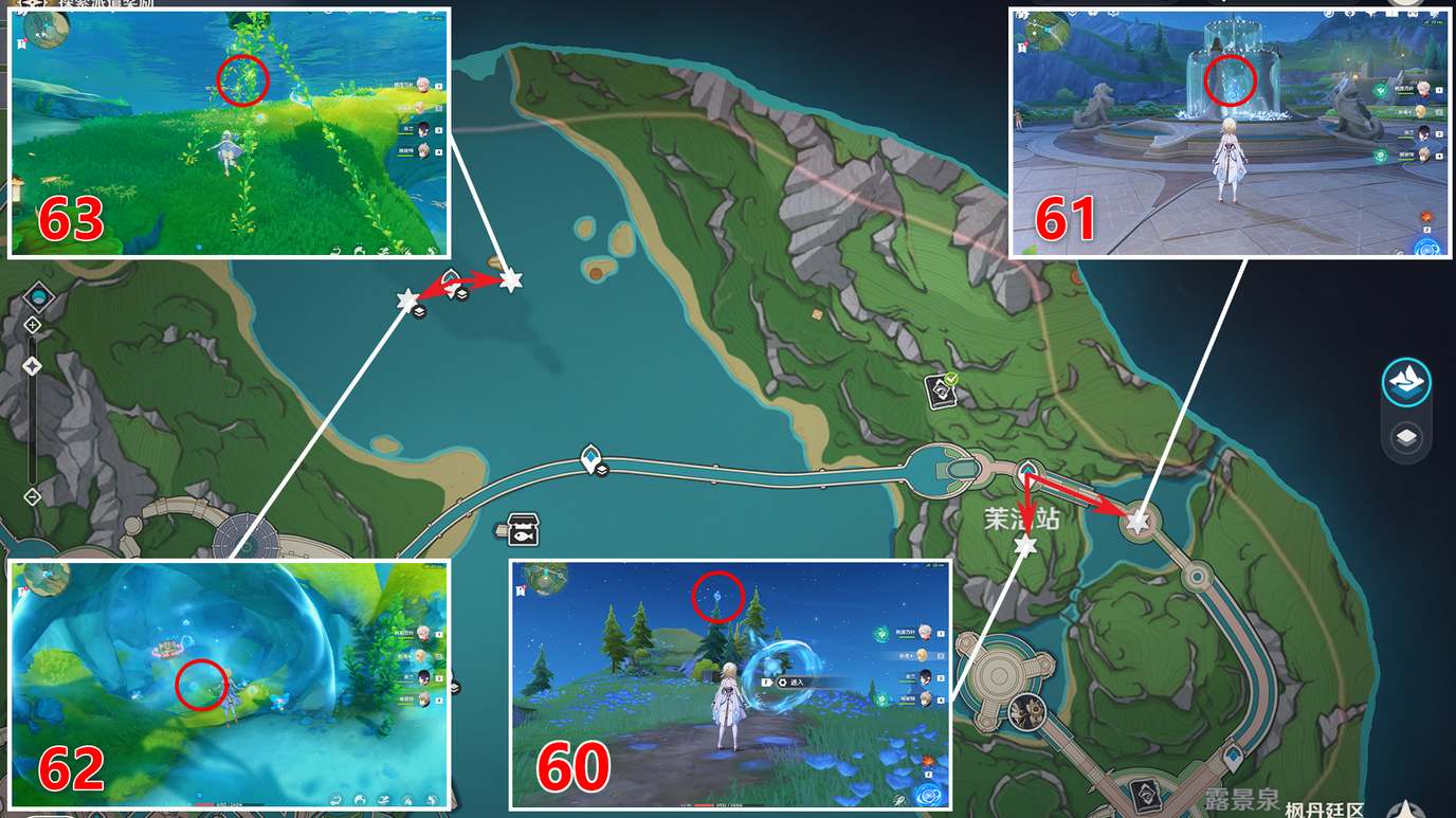 2、62号水神瞳需要三位仙女找到并引导突破结界后才能获得。仙女们的位置如下图所示: