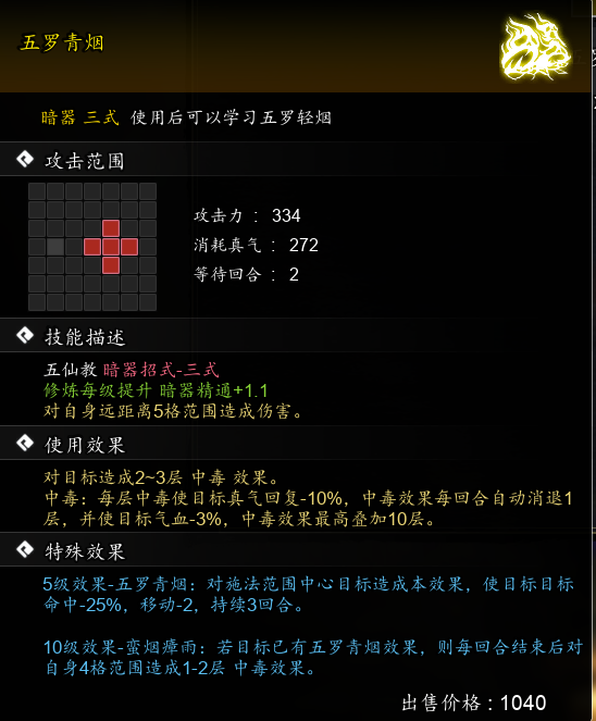 10级效果-野烟雨:每轮结束后,对自身4格范围内造成1-2层中毒效果。