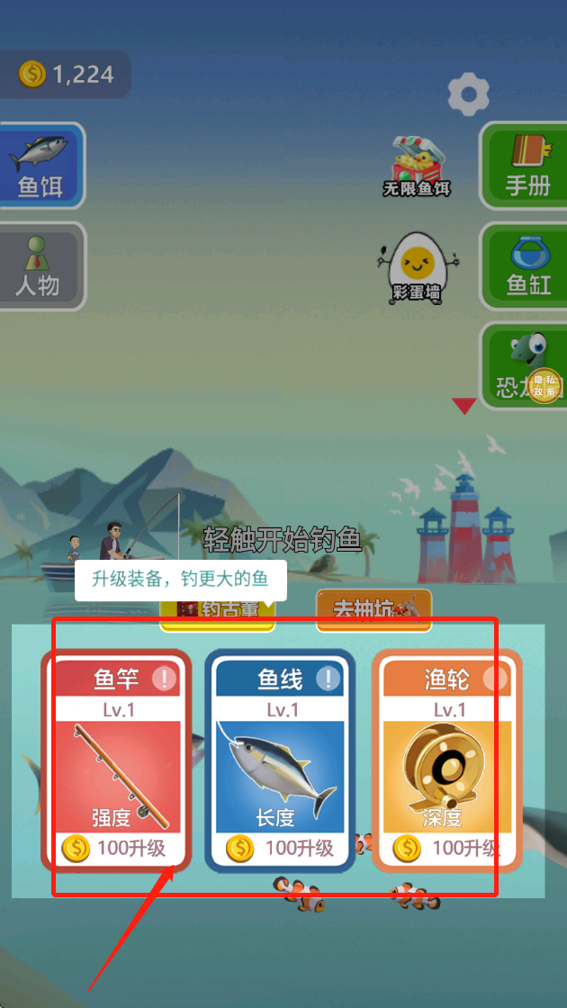 3.获得金钱后可以升级钓鱼工具。