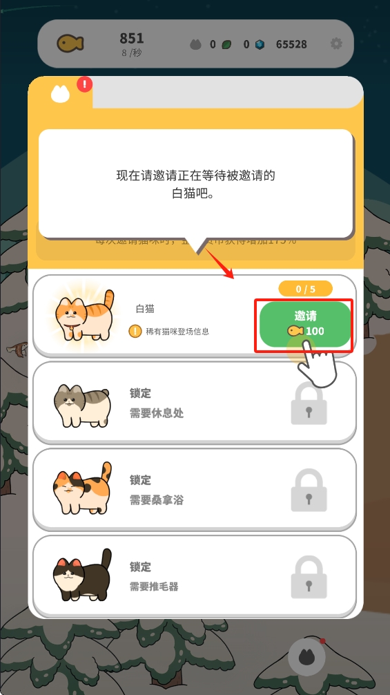 3.点击“邀请”按钮,花费金币邀请猫来村里生活。