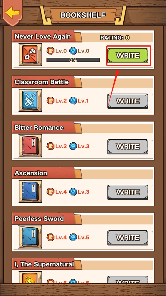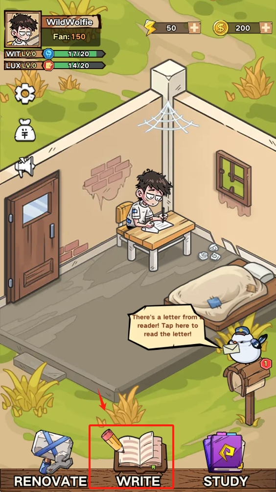 1、点击下方“WRITE”图标,进入写作游戏界面,准备开始创作。