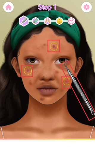 1.打开游戏,将痘痘针拖至框选处,刺破并清洁痘痘。