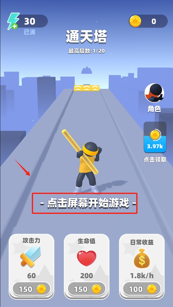 1.点击屏幕中央的“点击屏幕开始游戏”文字区域,进入游戏第一关,开始挑战。