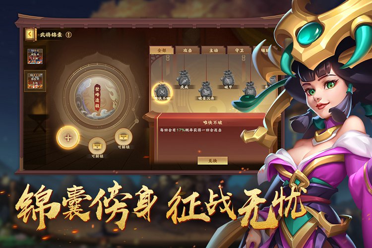 3.游戏中有众多经典的三国武将供玩家选择。每个将军都有自己的专长和技能。游戏过程中,必须根据武将的特点进行战术布局和技能释放,让战斗变得更加有趣和多样。