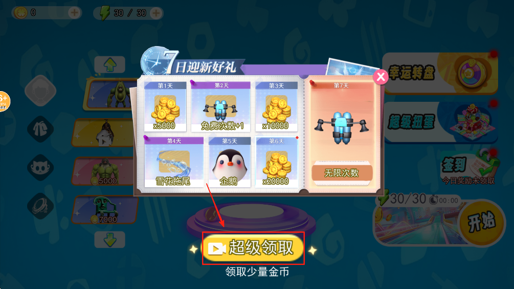 1.点击“超级领取”按钮即可获得每日奖励,积累金币和道具,为游戏做好准备。