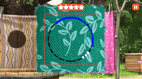 4.沿着圆圈剪下布料并将其缝到撕破的被子上。让我们一起体验森林探险的乐趣吧。