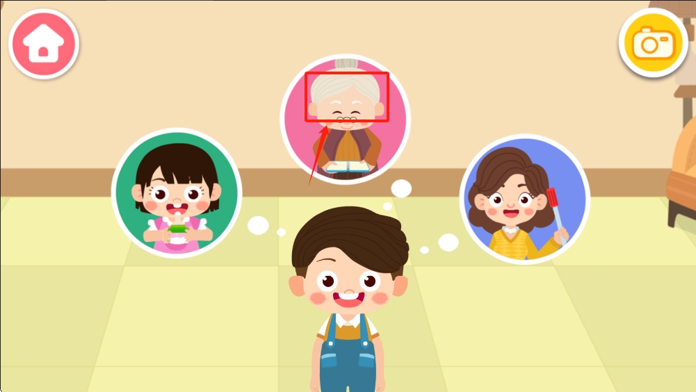 1.点击上方中间的爷爷头像,即可解锁家庭成员角色及相关小游戏任务。