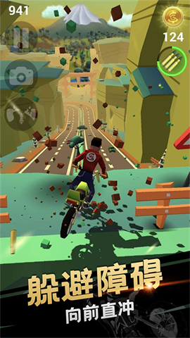 2.玩家点击屏幕控制自行车在赛道上的平衡,然后在前进的过程中躲避障碍物;