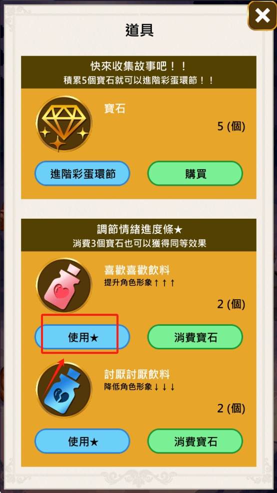 2.点击道具界面的“使用”按钮,可以使用宝石来提升角色形象或获得同等效果。