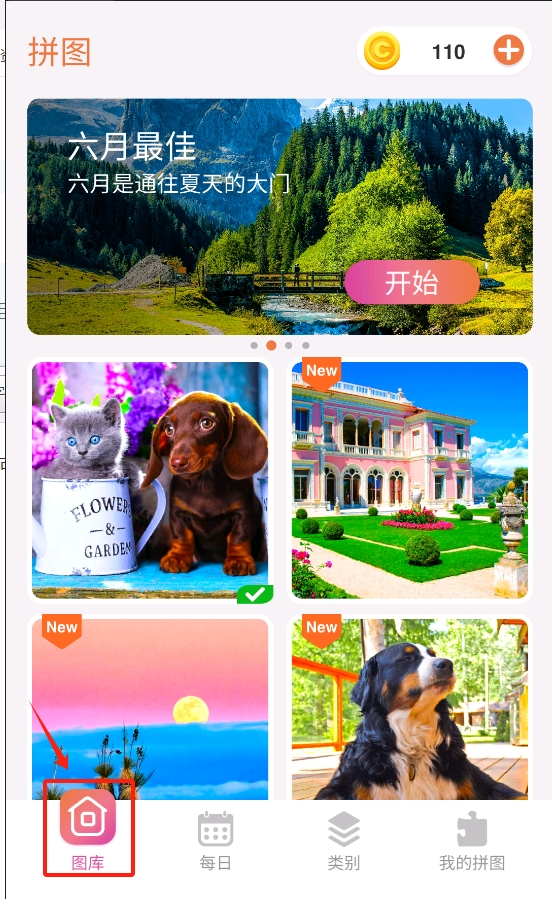 1.点击“图库”中的新拼图,选择拼图1,进入游戏页面。