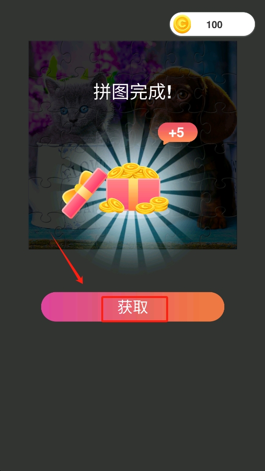 3.完成100块拼图后,点击“获取”即可获得+5积分并确认成功。