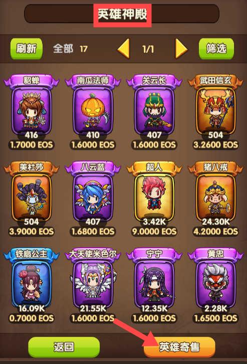 1.进入【英雄圣殿】界面,可以查看貂蝉、南瓜法师等众多英雄的信息。如果您需要管理英雄,请点击【英雄寄售】进行操作。