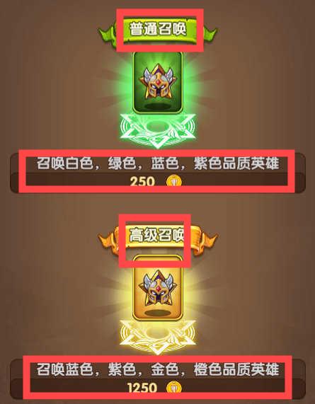 2.召唤英雄时,【普通召唤】可以召唤白、绿、蓝、紫品质英雄,【高级召唤】可以召唤蓝、紫、金、橙品质英雄。根据需要选择召唤方式。