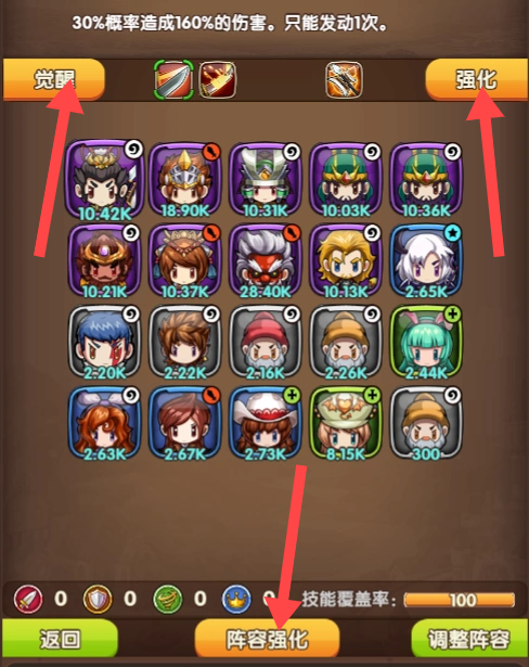 3、英雄培养方面,点击【觉醒】和【强化】可以提升英雄能力,使用【力量强化】可以优化阵容配置,提升整体战斗力。