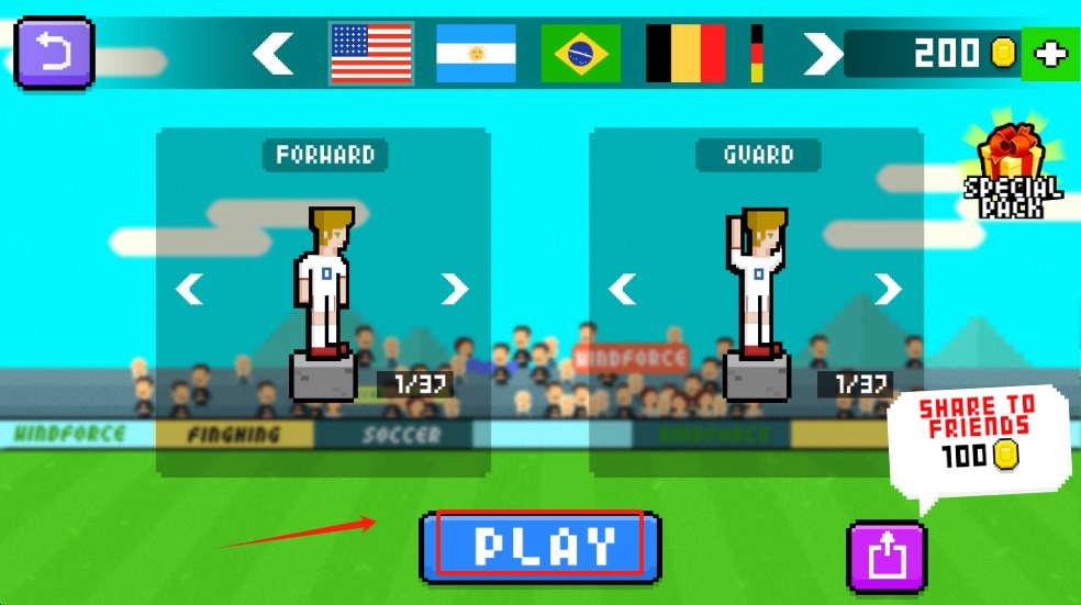 2、在角色选择界面,选择前锋或后卫角色,点击“PLAY”按钮开始游戏。