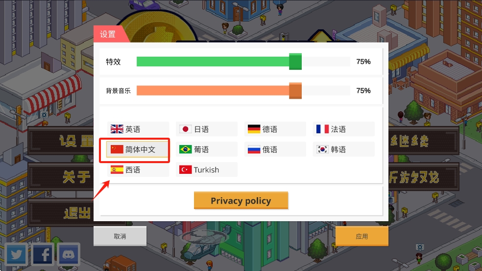 1. 在设置界面,选择语言为简体中文,调整音效和音乐,点击“应用”。