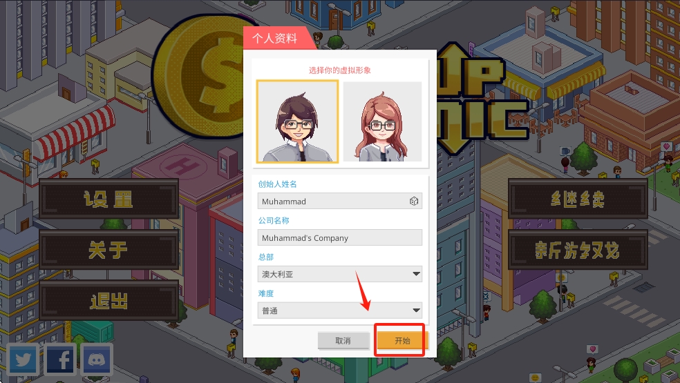 3、在信息界面,输入创始人姓名、公司名称、总部地点,选择难度,点击“开始”。
