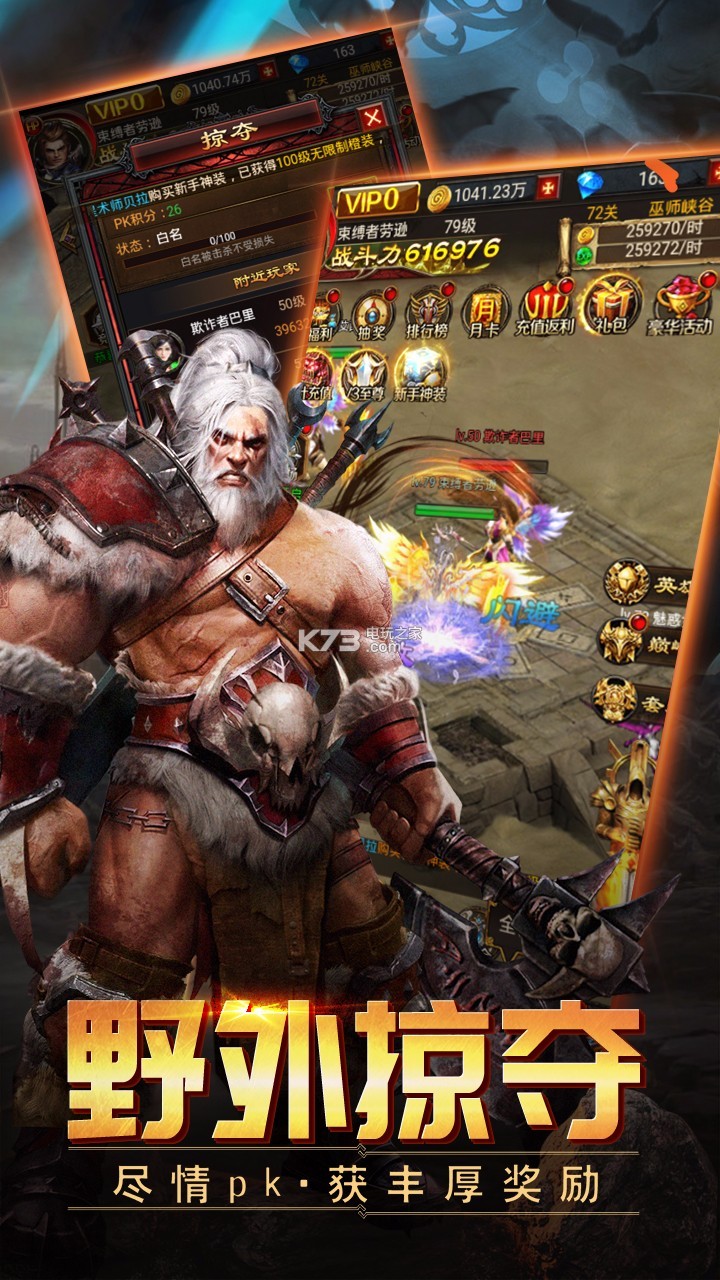 2.野外地图自由PK,抢BOSS,击杀敌人。最好的装备就是你的。装备掉落的概率非常高,增加了游戏的娱乐性。