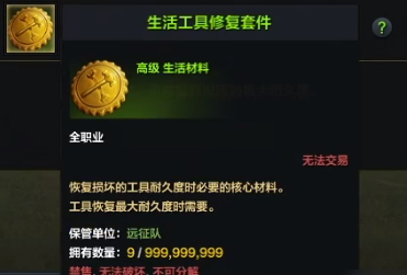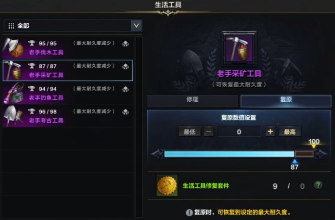 3、点击修复进行修复(耐久满则无需修复)。可以看到,修理生活工具需要生活工具修理包。