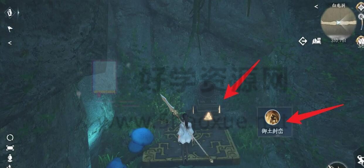 4、然后跳下去,继续往前走,看到一个土属性的日晷。站在日晷上,使用挡土功。