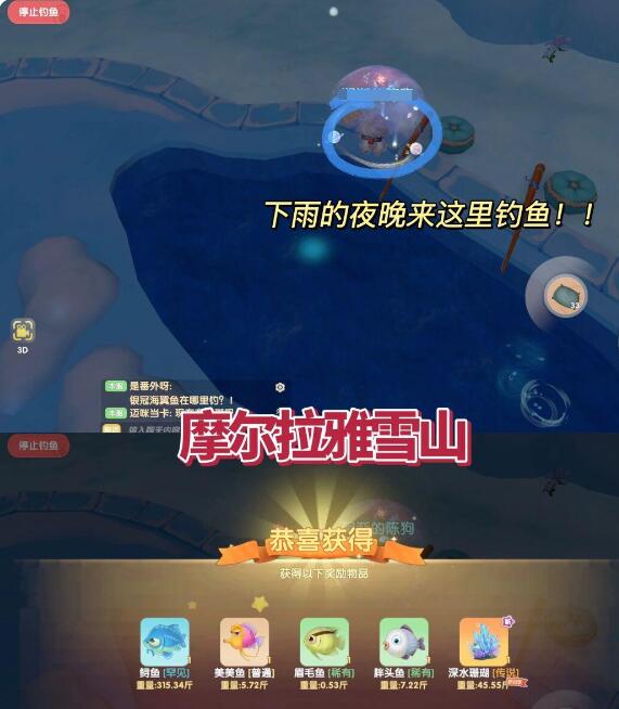 答:莫拉雅雪山雨夜20:00-6:00钓鱼获得。