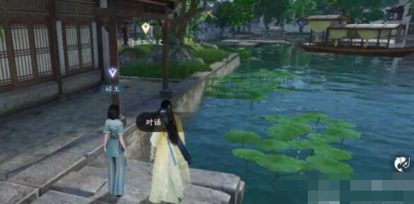 2.在西湖边的房子如图位置找到NPC穗玉,与她对话,接受冒险任务“寻秦”。