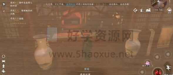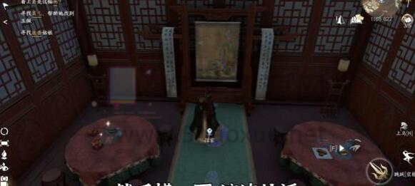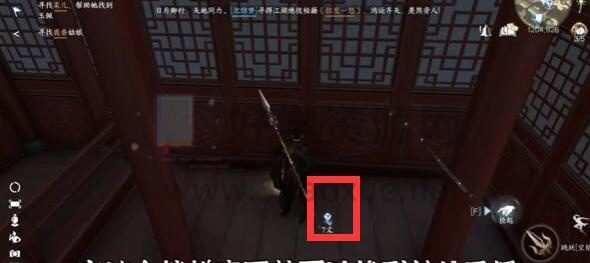 6、我们把画交给蔡桑,前往坐标:(1186,921)帮助柔儿找到玉佩。玉佩位于楼梯下坐标(1205,926)处。