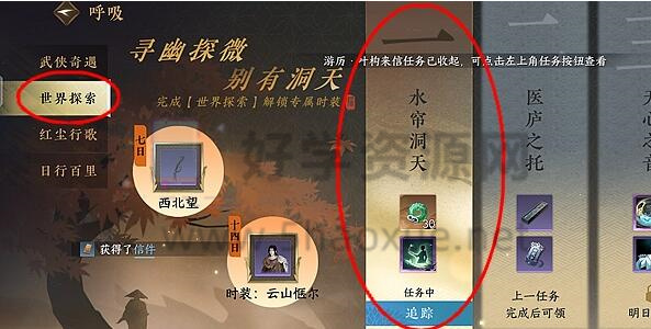 2、然后点击世界探索中的追踪任务【水帘洞】。