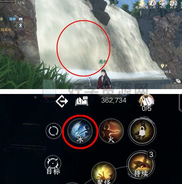 5.到达任务地点的瀑布时,使用冰系技能将瀑布冻结,然后使用普通攻击打破冰层进入洞穴。