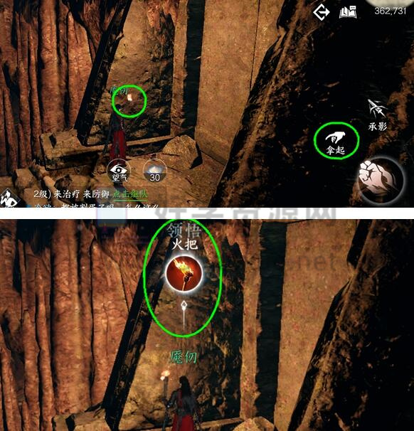 6、然后按照任务提示,拿起火把了解并获得江湖技能火把。