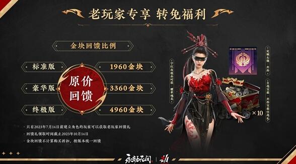 3、老玩家奖励包括:回魂花主题宁红叶服装【荣耀世界魂花】、定制头像【公金】、【公金宝箱可选赠品】x10、购买版本对应价格的金块。 (标准版1960金块,豪华版3360金块,旗舰版4960金块)