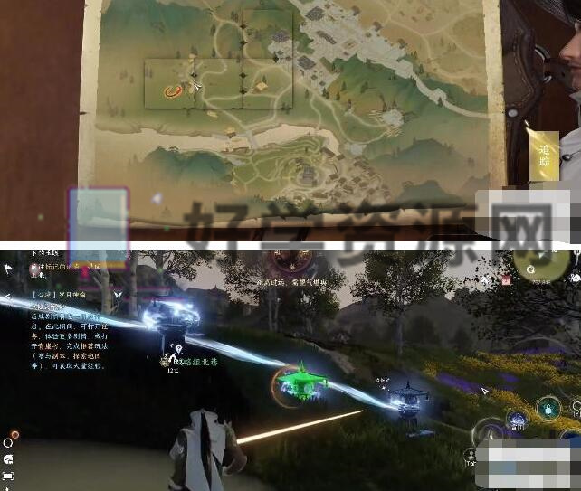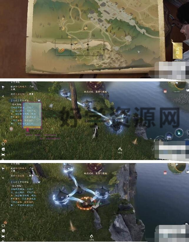 4、然后打开卷轴2,如图所示拼凑起来,得到雁门关坐标:624909。使用江湖技能:吸星抓月。将中间的石墩拉开,打破雷电即可解锁宝箱。打开它可以获得石眼。