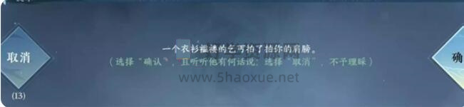 4.最后,一个老乞丐走过来拍了拍我们的肩膀。给他任何他想要的东西。对话结束后即可触发冒险任务。完成冒险任务后,我们可以通过对话选择加入乞丐帮。