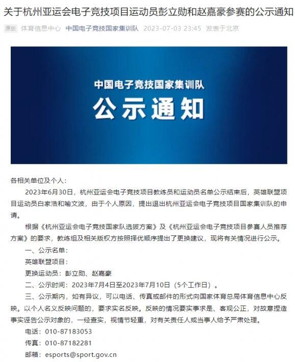 按照《杭州亚运会电子竞技国家队选拔计划》和《杭州亚运会电子竞技参赛选手推荐计划》的要求,教练组和相关版权方按照成绩先后提出了替换建议,现将有关情况予以公告。