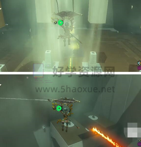 6、然后下来把刚才掉落在风扇上的道具装好,启动喷火装置放回去,点燃周围的柱子。
