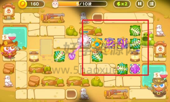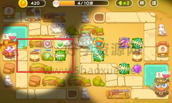 4、关键防线在右侧。清除障碍并赚到钱后,建造更多的满级炮塔。对面线上的兔子怪基本无法通过。