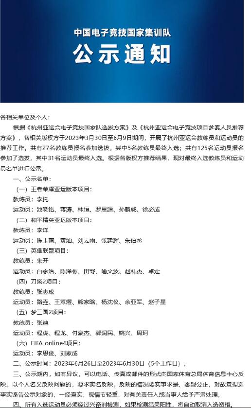 参加杭州亚运会电子竞技比赛运动员名单公布: