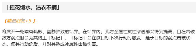 屏障内敌人抵抗力增加,当敌人弱点被击破时,被标记,延迟其行动,并对其造成冰冻伤害。
