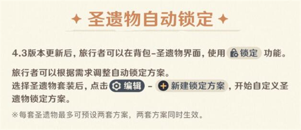 原神如何自动锁定圣物? 原神4.3版本即将上线圣物自动锁定功能。玩家需要完成套装锁定方案的编辑并启用自动锁定功能。今天小编给大家带来了圣物自动锁定方法图文攻略。需要这篇文章的玩家不妨来看看。