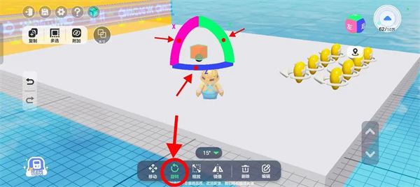 4. 点击【旋转】,会出现粉色、绿色、蓝色条。拖动以调整视角。