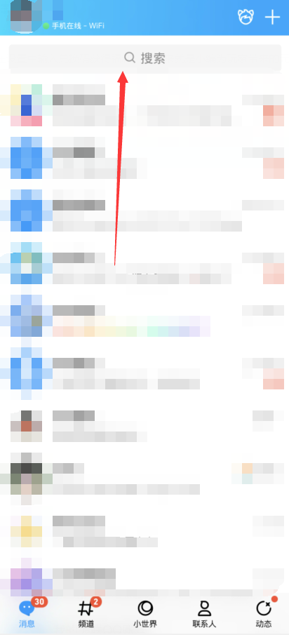 1、首先打开QQ,进入首页,点击顶部的搜索框;