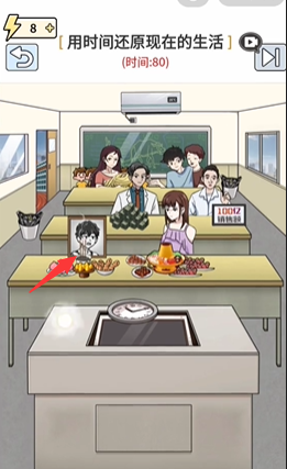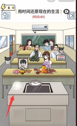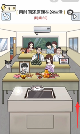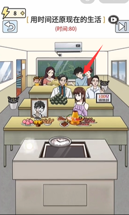 9、拖动闹钟放到最后一排男孩身上,成功吃到软饭;