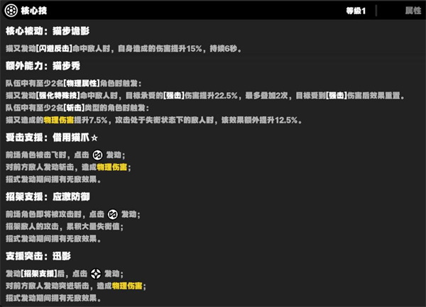 5.【核心技能】:猫影步、猫步秀、借猫爪、压力防御、迅影
