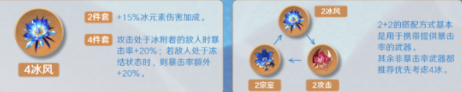 4件套攻击附着冰块的敌人时暴击率+20%;如果敌人被冰冻,暴击率额外+20%。