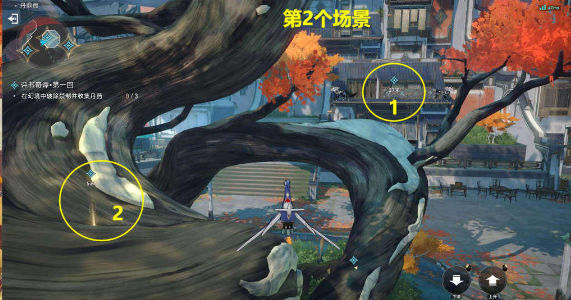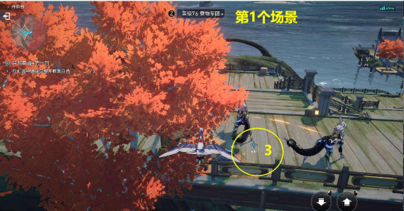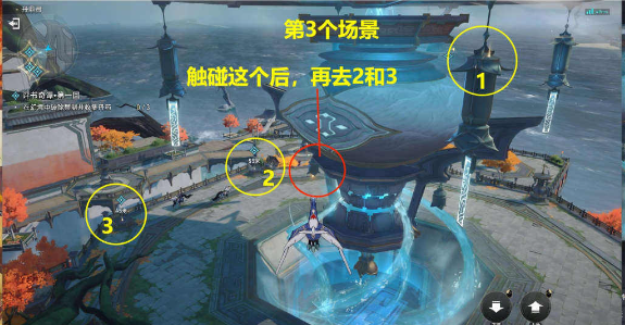 8、第三个场景:按照引导到达下图三个地点,打破三个限制。注意第二个和第三个位置,先触动红圈内的铃铛引诱第二个和第三个怪物,然后再去第二个和第三个位置。只需在三个地方拾取即可。