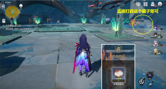 4、继续引导你前往地点,前往下图位置砸碎黄圈内的罐子即可获得物品,并继续传送至副本初始位置;