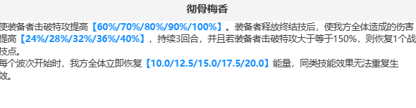 3.技能:穿骨梅花,增加佩戴者的特攻。释放必杀技后,我方全体成员造成的伤害增加,持续3回合。
