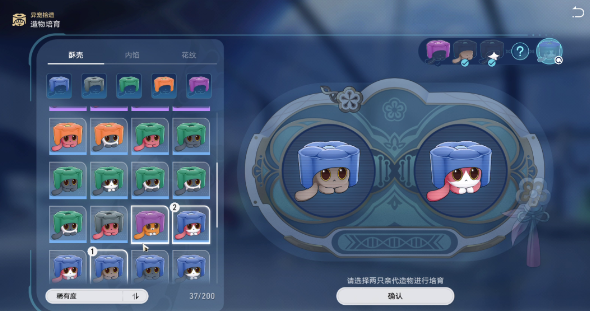5.返回【生命烘焙箱】,切换目标为【青鸟喵】,选择对应特性的桂花糕进行培育。特点是:紫色“外壳”、紫色“馅料”、白色图案;