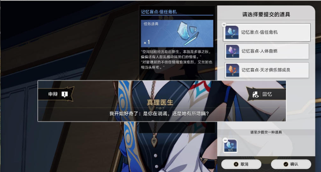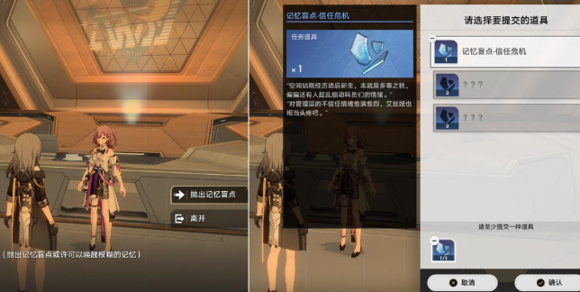 5、完成传送到下图位置后,与【埃西塔】对话【抛出记忆盲点】,选择第一个【记忆盲点信任危机】提交给你并【确认】;