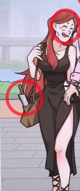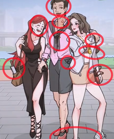 1.右边的女孩:把外套和衣服给男孩,项链给左边的女孩,放下肩膀和手,把包里的化妆品给左边的女孩。